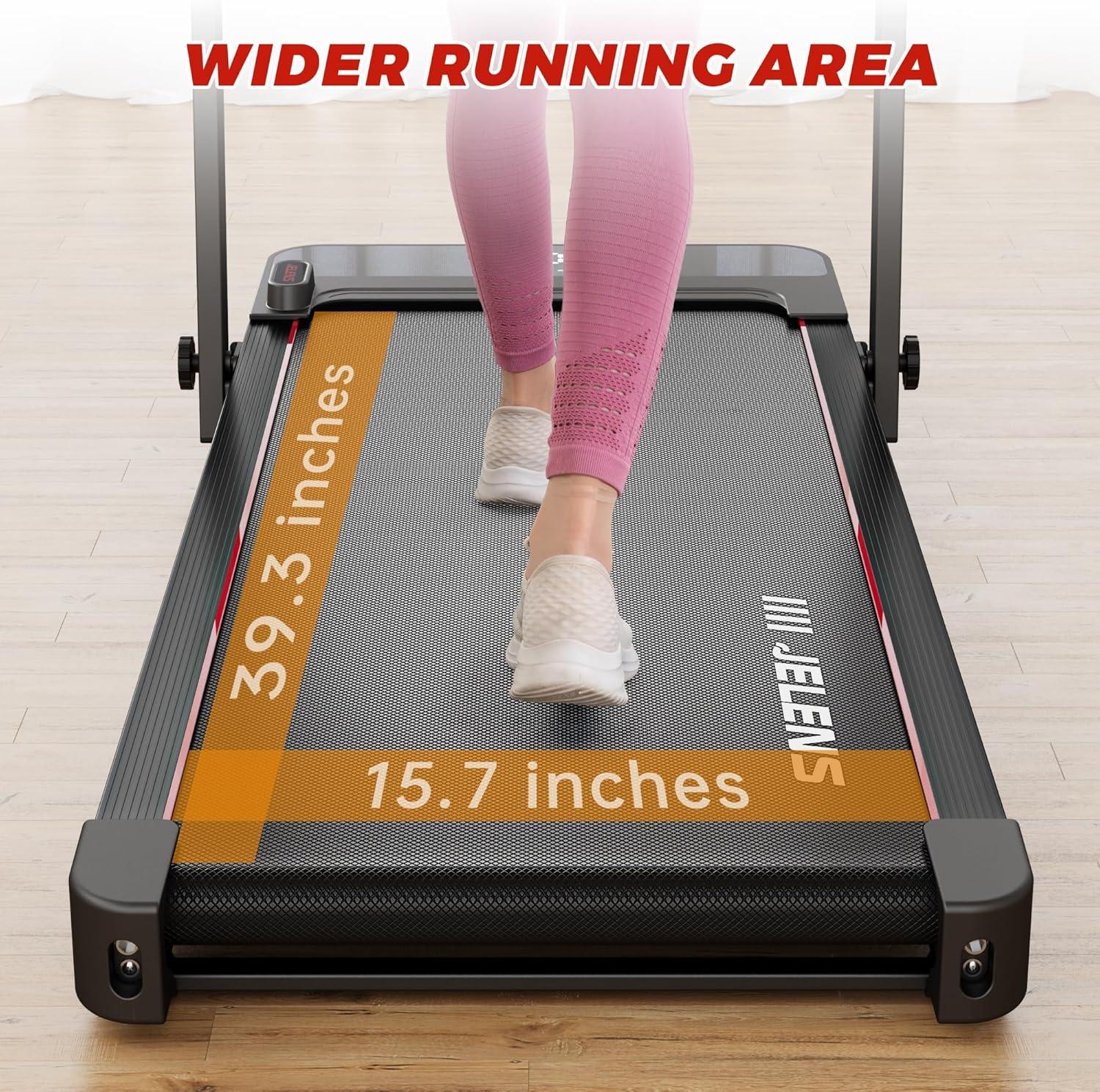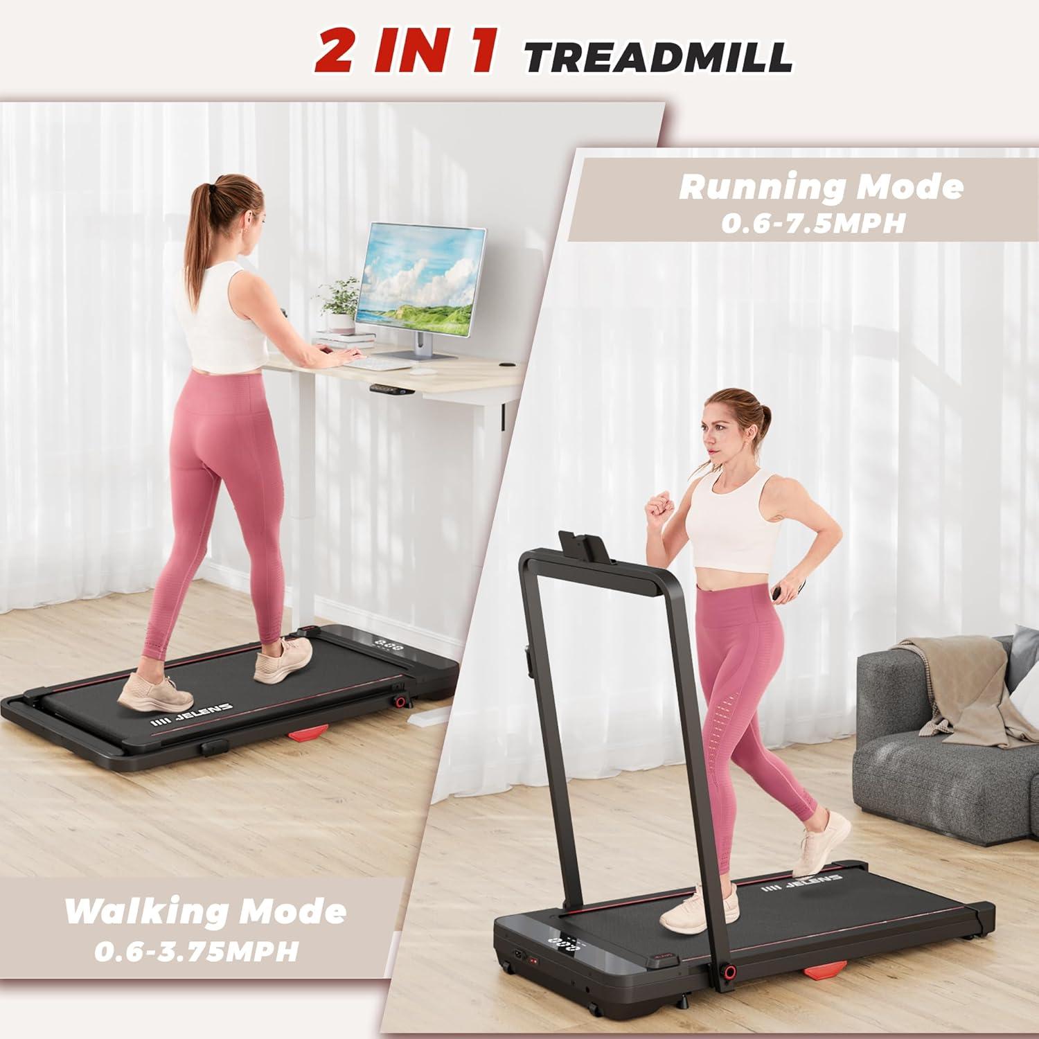 2 in 1 Folding Treadmill: JELENS 2-in-1 treadmill has two modes to meet your fitness and health needs. When the riser is folded, the speed ranges from 0.6 to 3.75 MPH. When the riser is in an unfolded state, the speed is between 0.6 to 7.5 MPH.