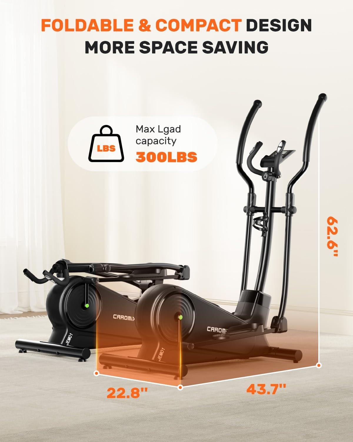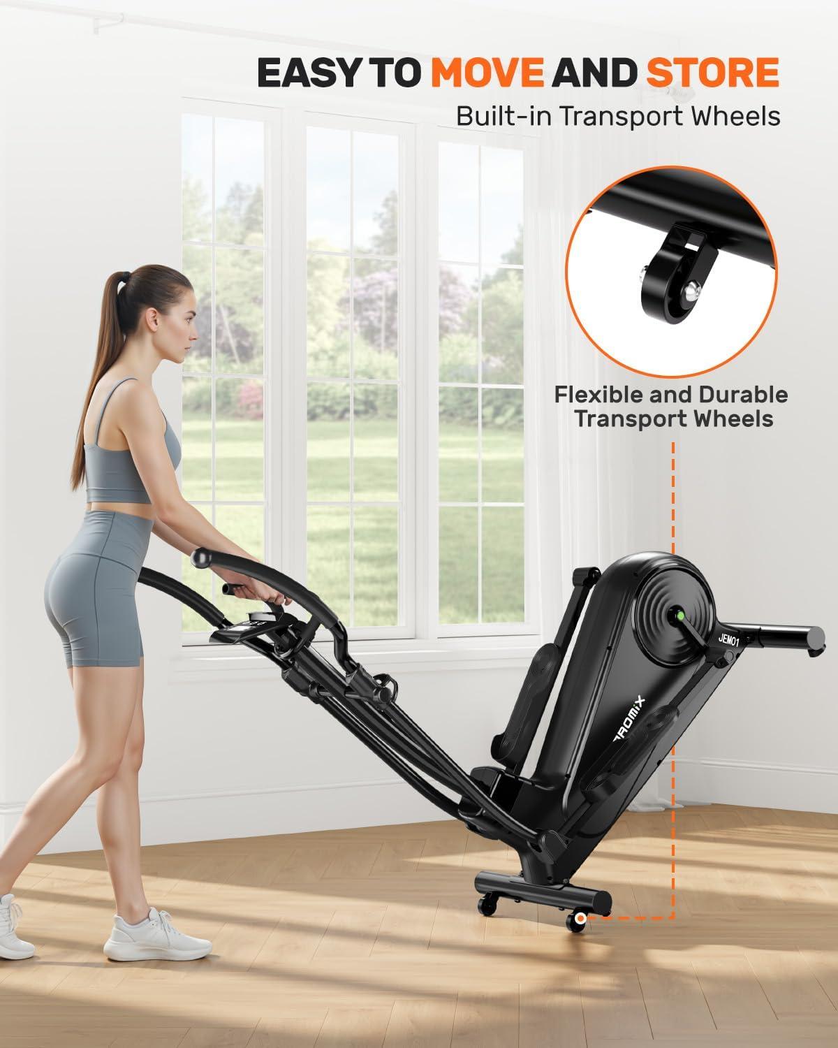 Easy Mobility & Space-Saving: Move and store your elliptical trainer effortlessly with built-in transport wheels. Its compact and foldable design maximizes space utilization, keeping your home gym organized and clutter-free.