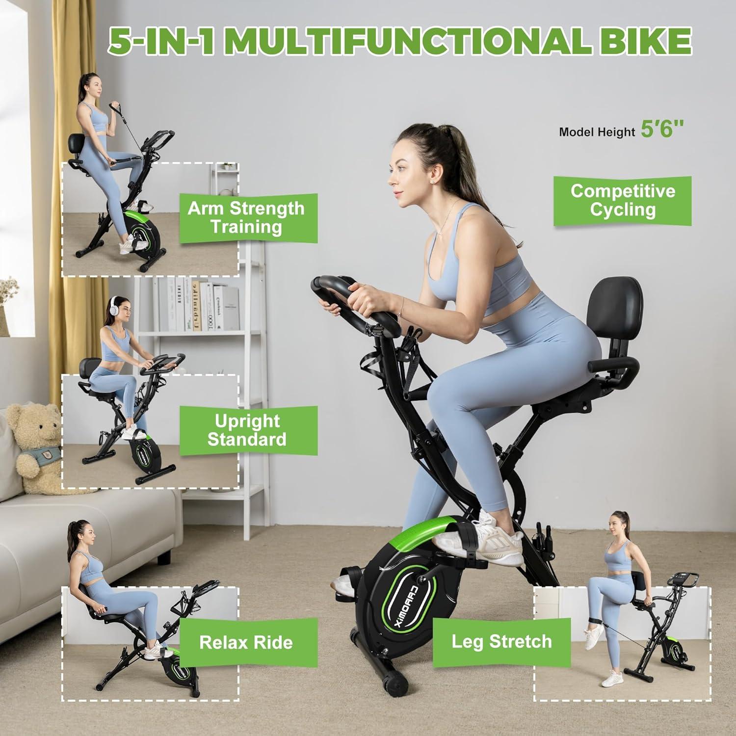 Caromix Folding Exercise Bike, 5 in 1 Stationary Bike with 16-Level Adjustable Magnetic Resistance, 330LB Capacity Indoor Workout Bike, Foldable Exercise Bike for Seniors and Adult(Black)
