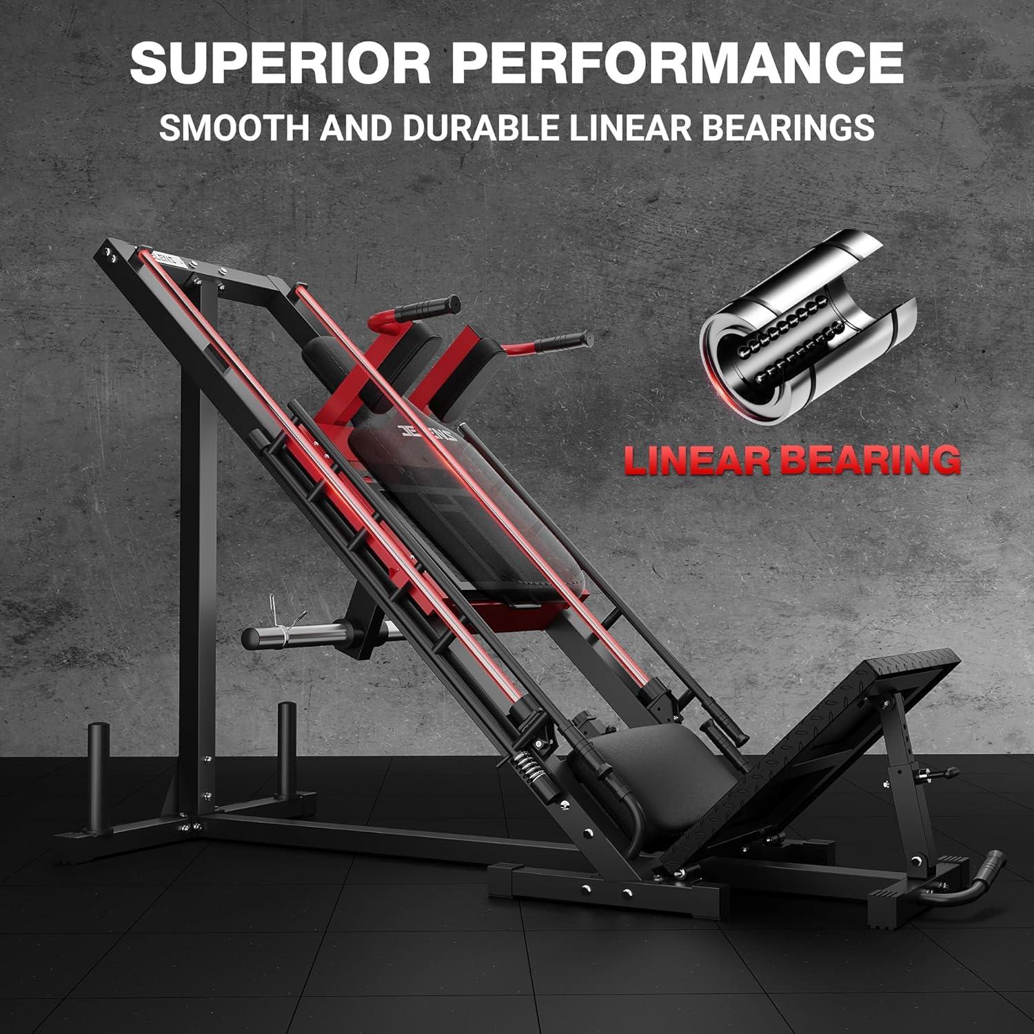 【Engineered for Comfort】This hack squat machine features a linear bearing system that ensures a seamless, jam-free glide—far superior to traditional roller designs. Premium anti-slip, wear-resistant leather pads, thickly cushioned for maximum comfort, let you train confidently during every session on the hack squat machine. This thoughtful combination delivers lasting support without ever compromising your workouts