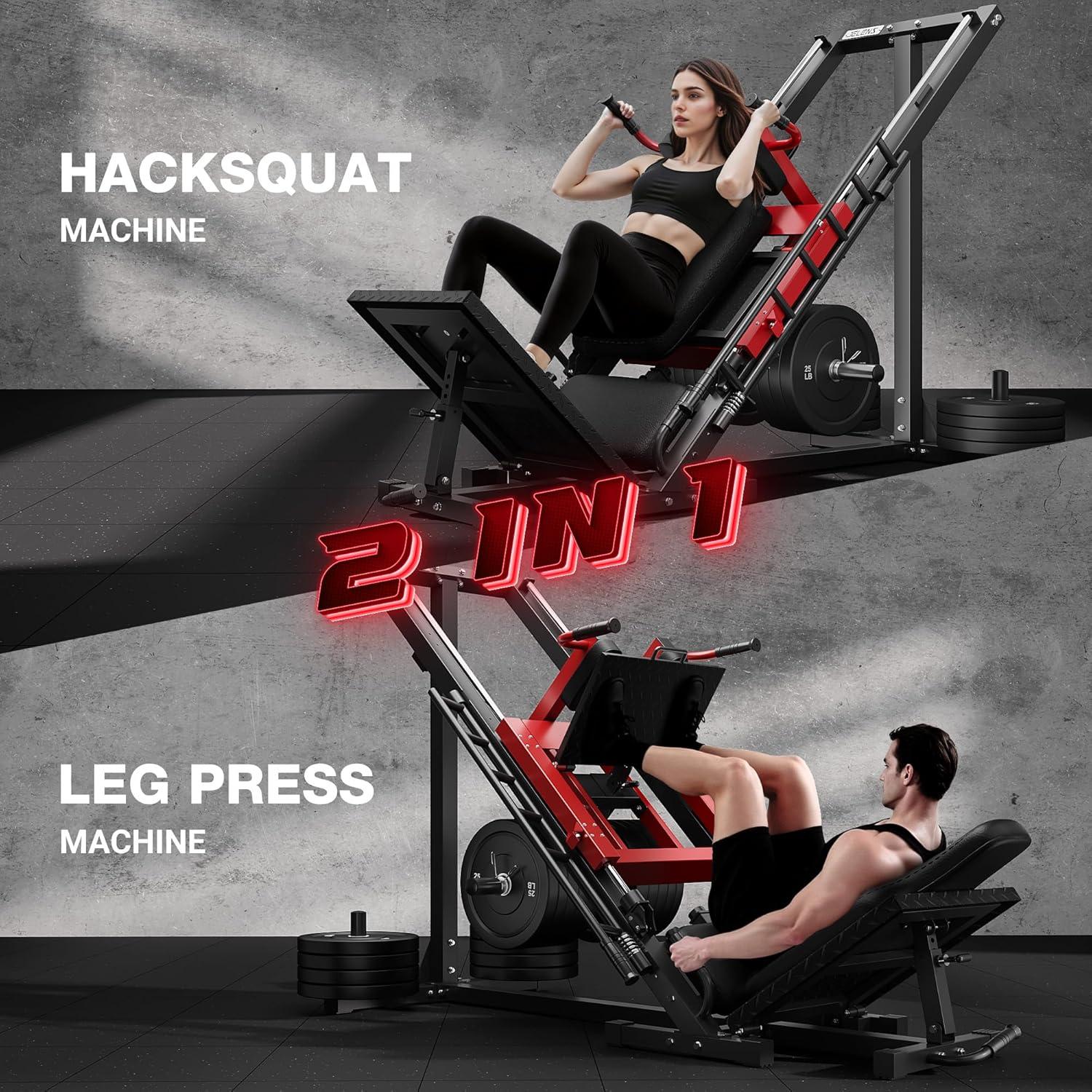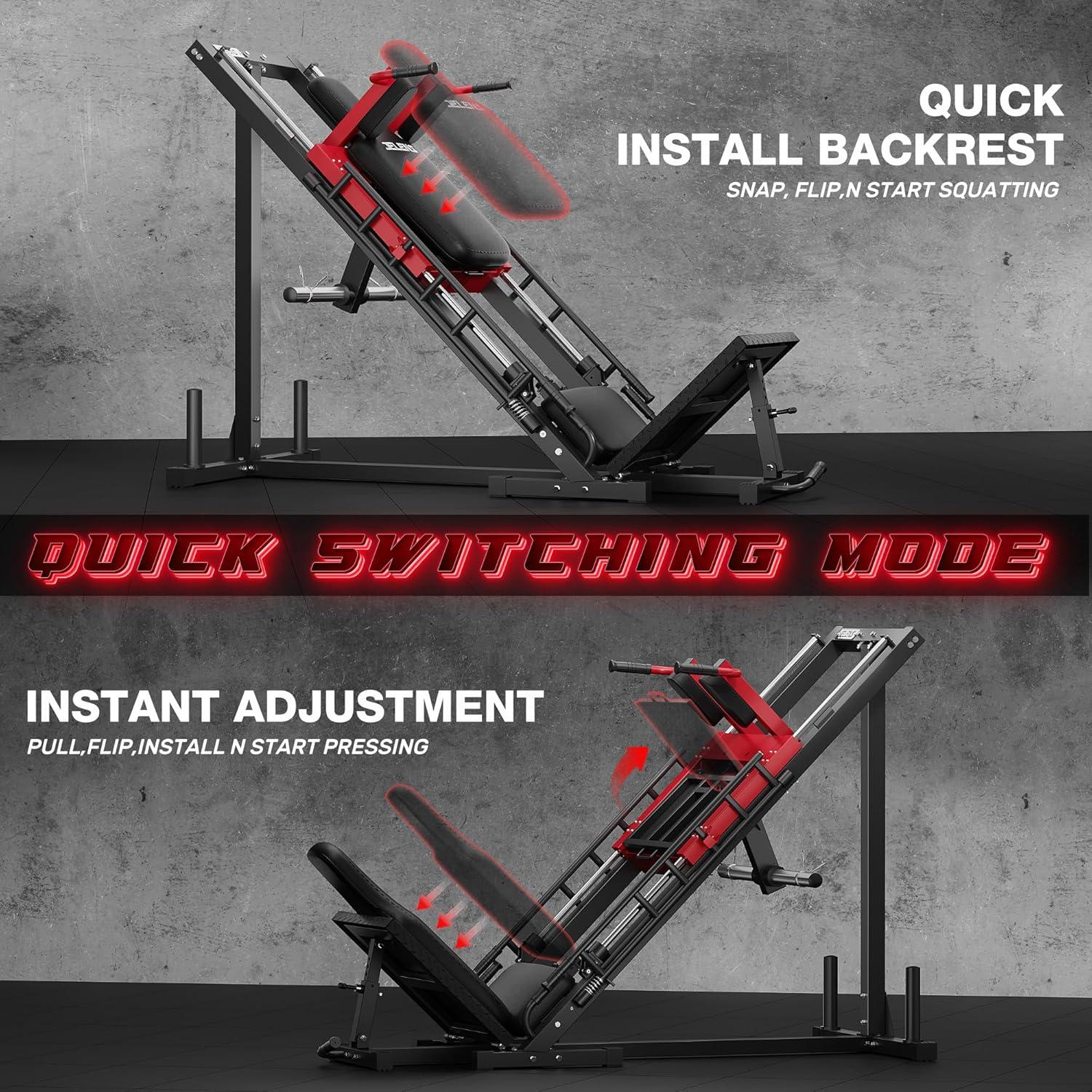 【Upgrade Configuration】The multi-adjustable leg machine offers 5 hack squat angles and 3 leg press settings to suit any body size or fitness goal. Effortlessly switch between modes in seconds by flipping the backrest and adjusting the footplate. The smooth side rail system features safety catches and ergonomic aluminum alloy handles for secure, jerk-free motion. Added cushioning pads at the base reduce impact and noise, enhancing stability and comfort with every action
