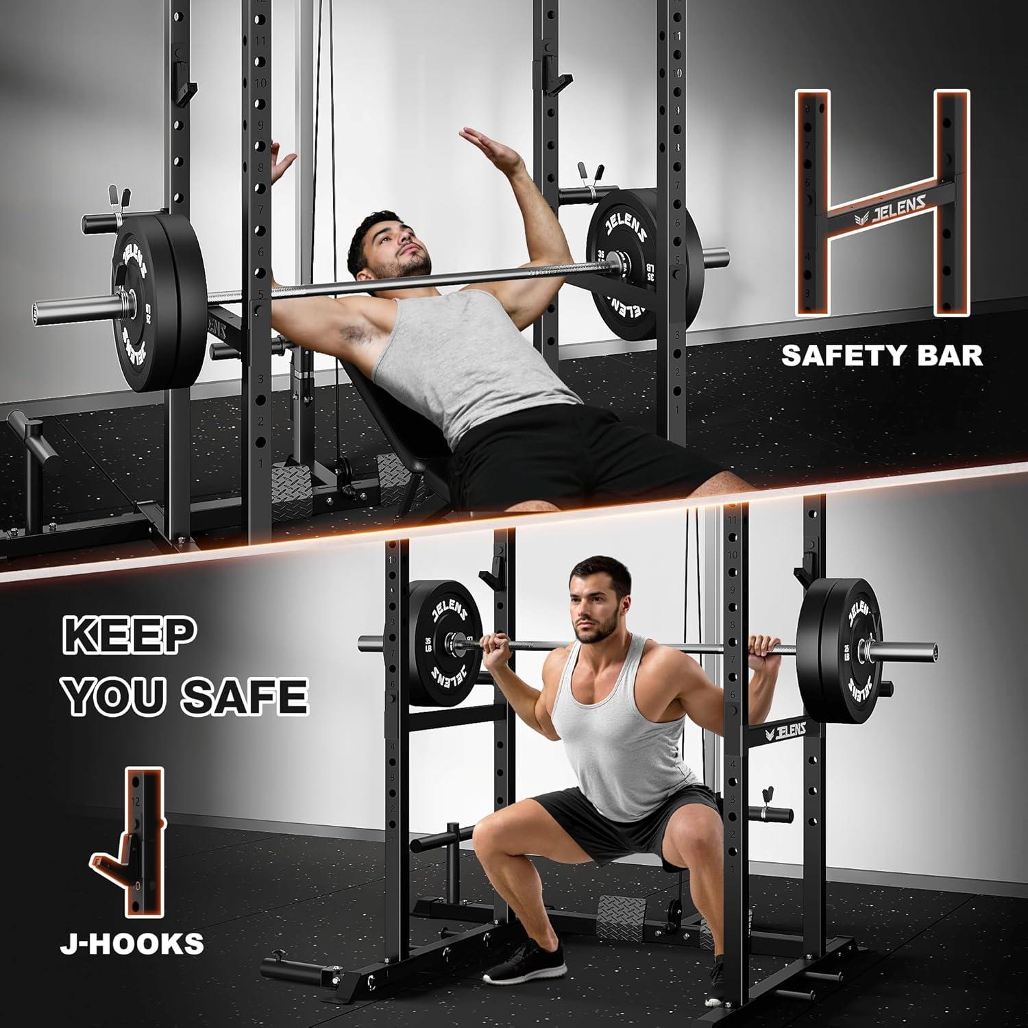 【Powerful Storage Function】The JELENS squat rack not only offers stable training support but also is equipped with four weight storage systems, which are integrated with the main body of the squat frame, making it convenient for users to efficiently manage the barbell plates and training space. Meanwhile, hooks are equipped on the upper part of the shelf, allowing for quick storage and access to accessories