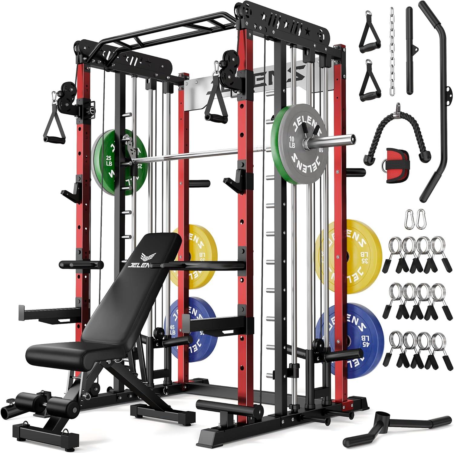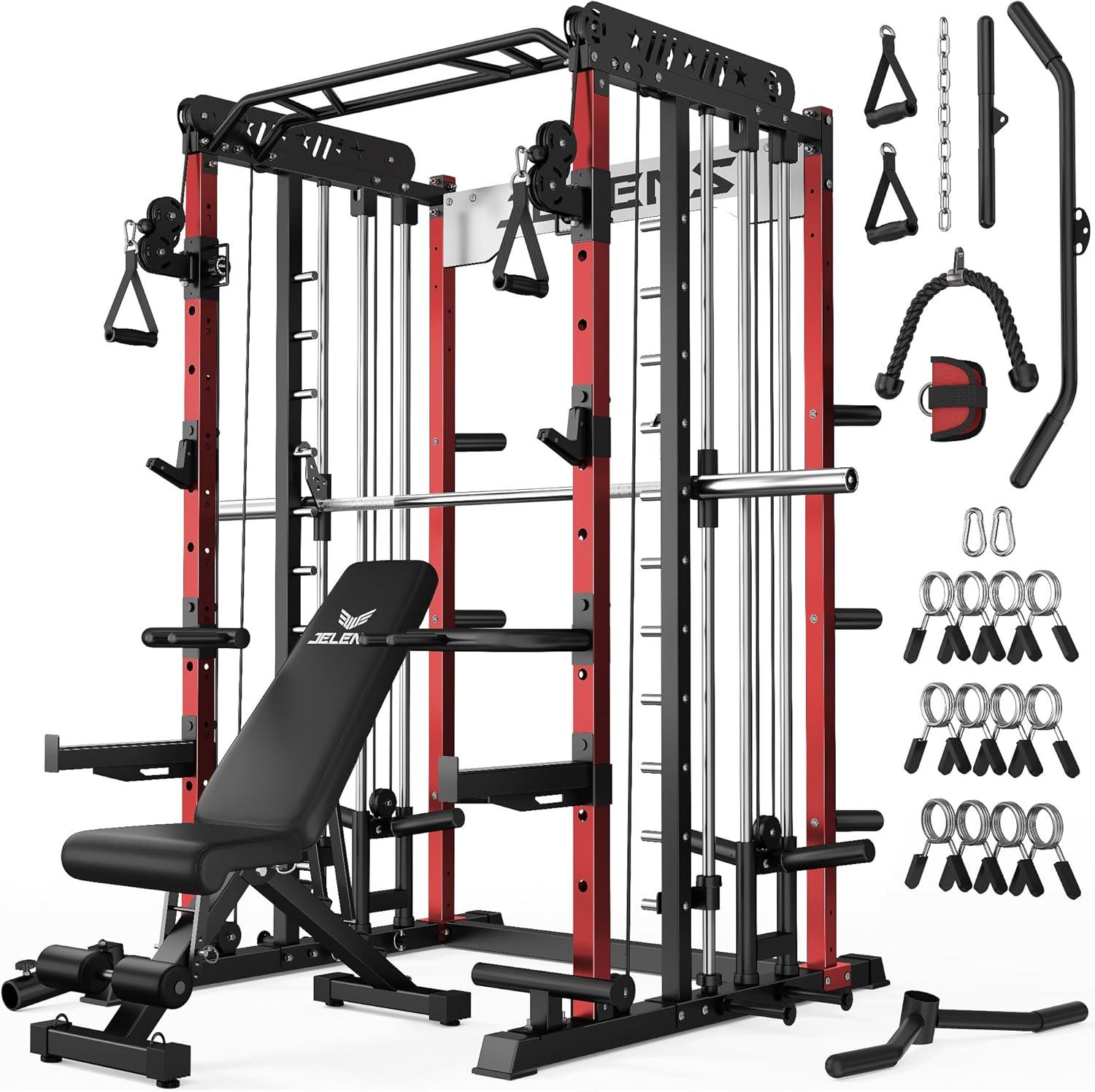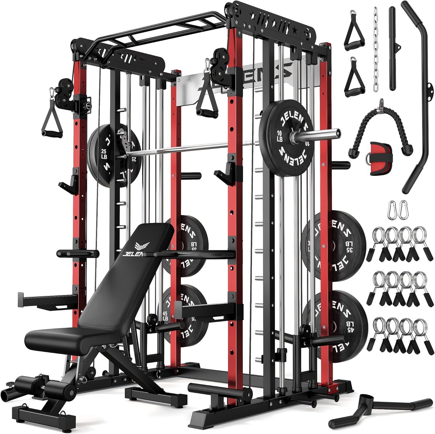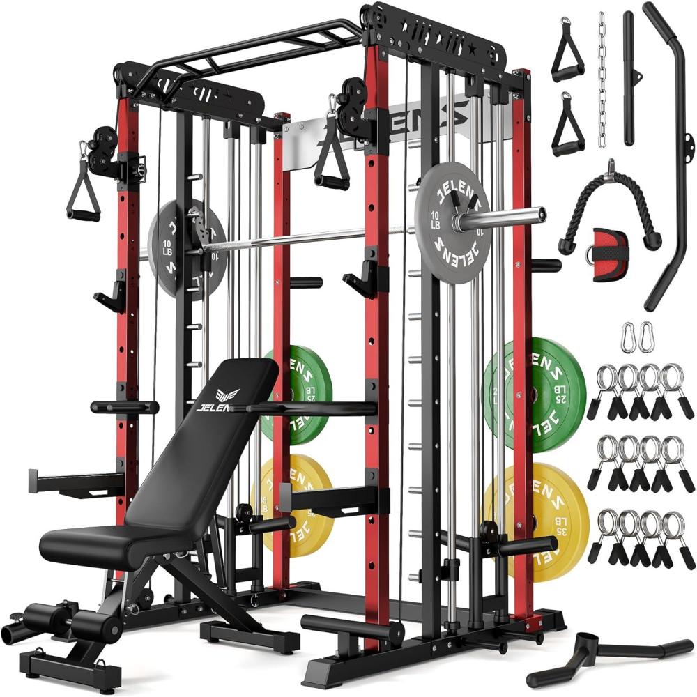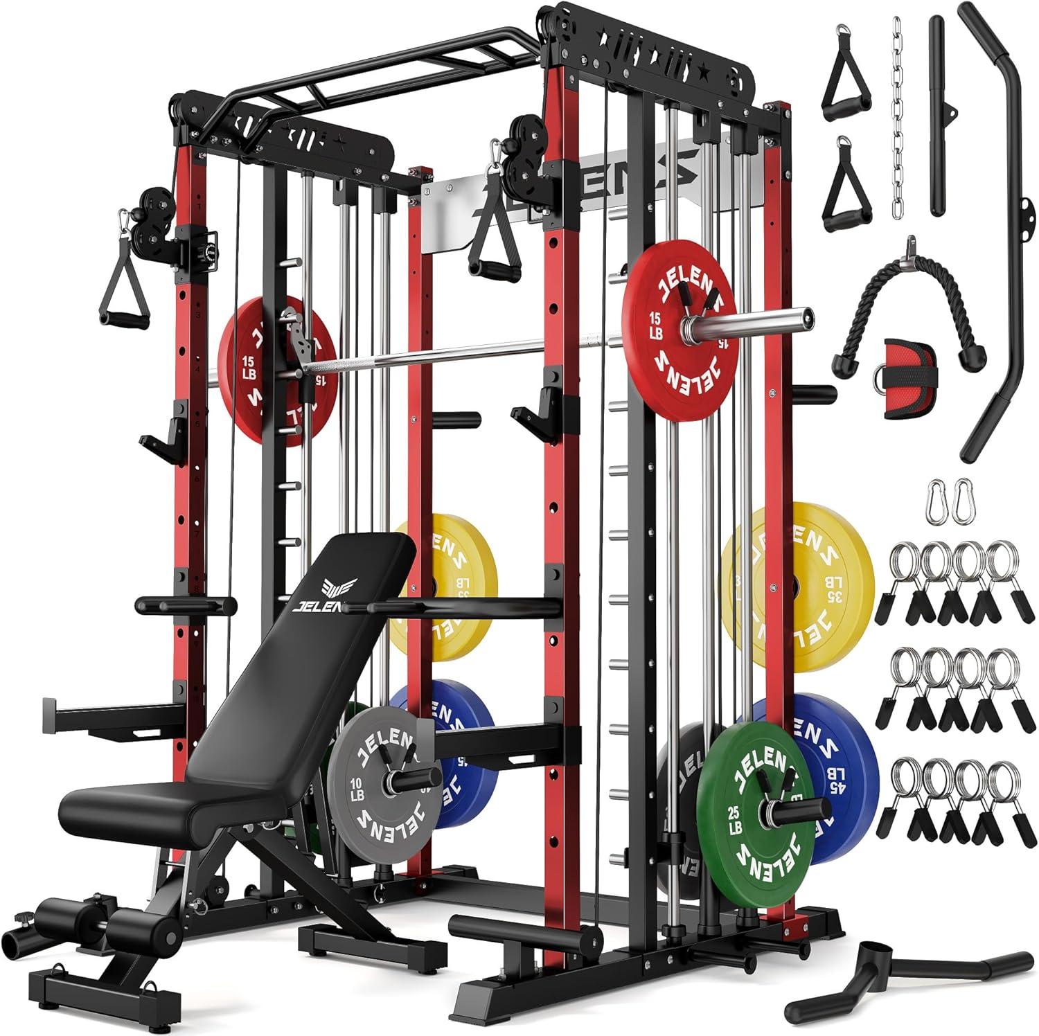 [Full-Body Workout]: With JELENS Smith machine for home gym, you can exercise your entire body using just one single machine. It's an ideal all in one equipment for squats, pull-ups, bench presses, lat pulldowns, cable flyes, barbell rows, shoulder presses, deadlifts and so on. This fitness machine provides you with a program designed for comprehensive muscle development