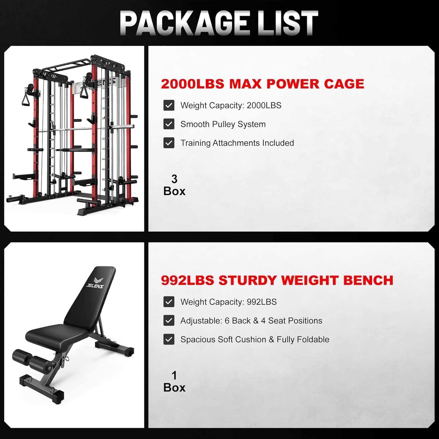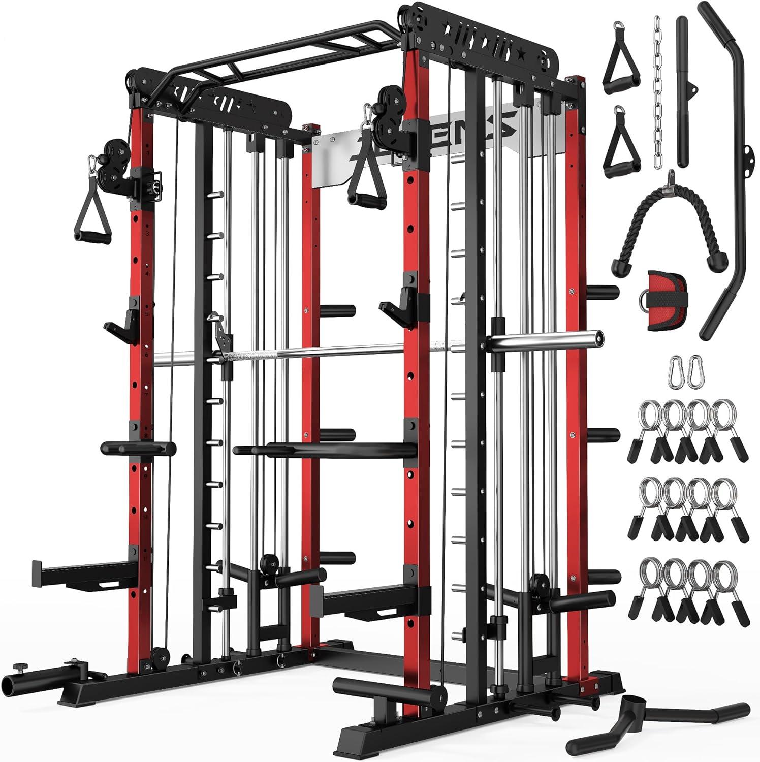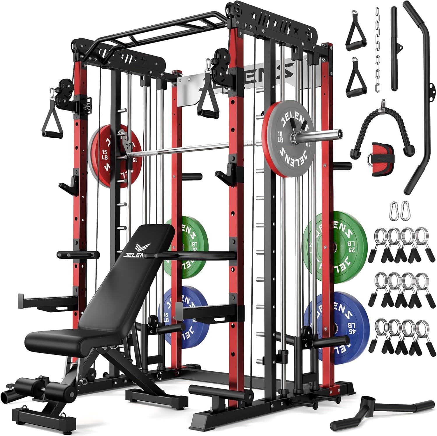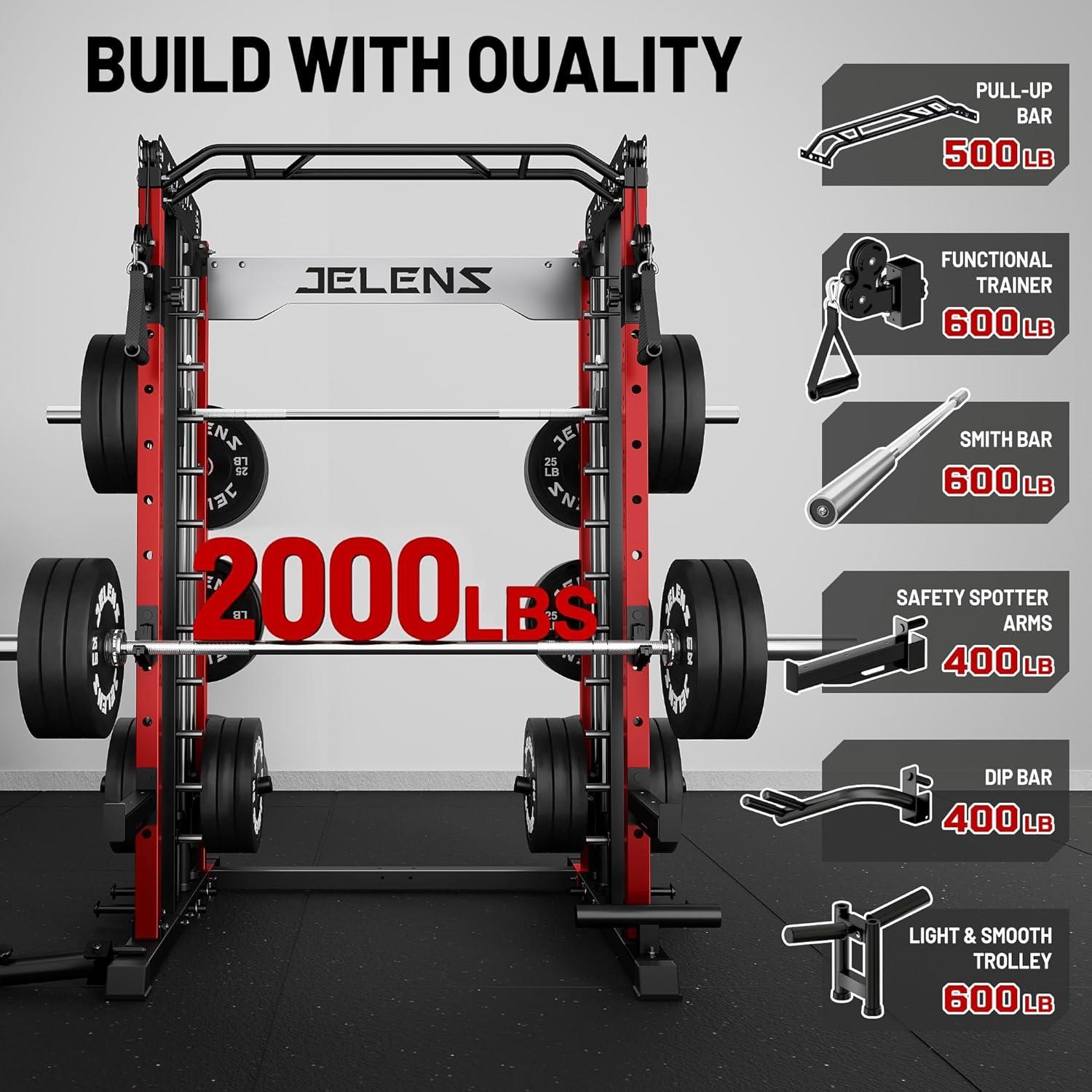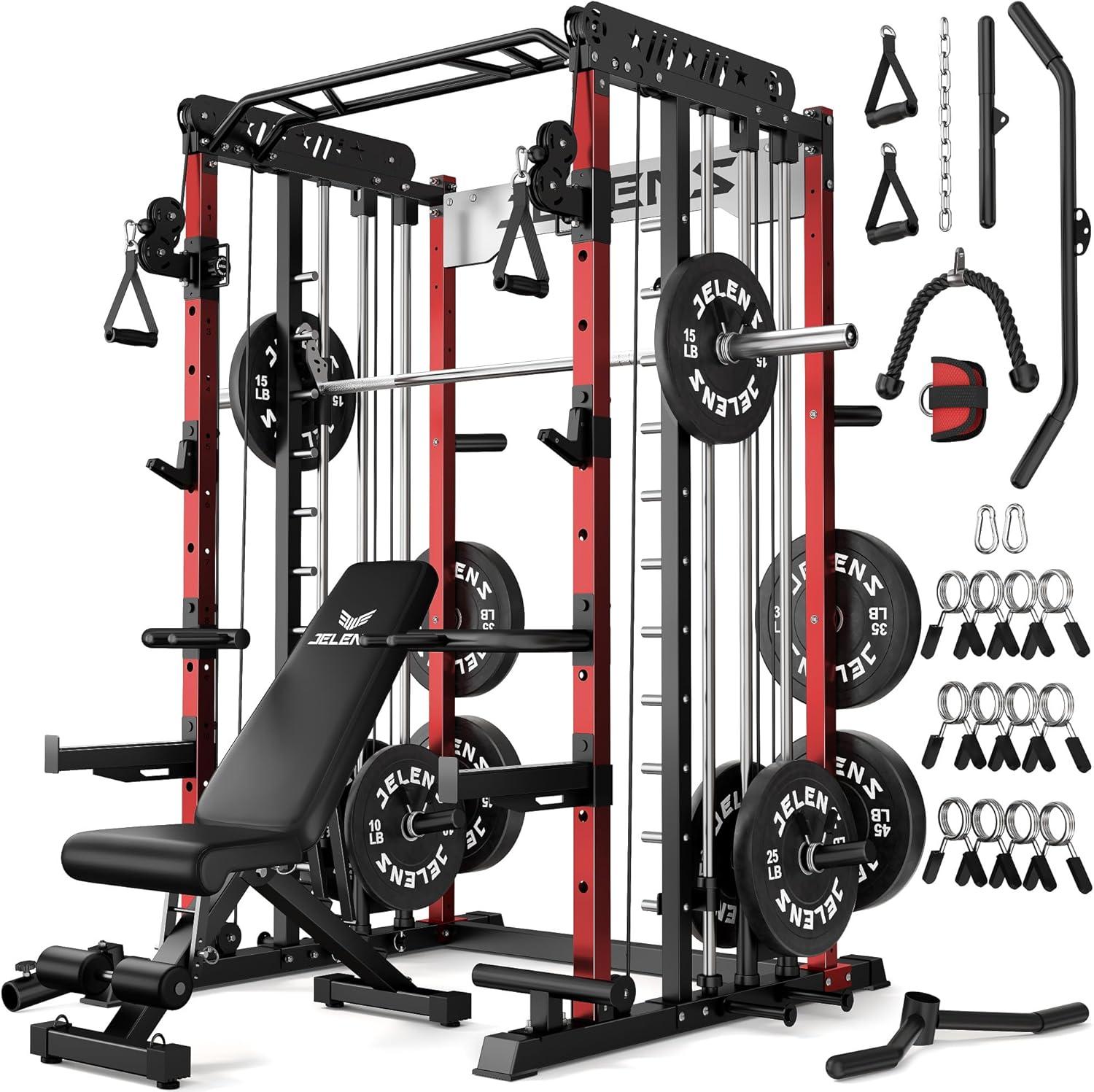 [Full-Body Workout]: With JELENS Smith machine for home gym, you can exercise your entire body using just one single machine. It's an ideal all in one equipment for squats, pull-ups, bench presses, lat pulldowns, cable flyes, barbell rows, shoulder presses, deadlifts and so on. This fitness machine provides you with a program designed for comprehensive muscle development