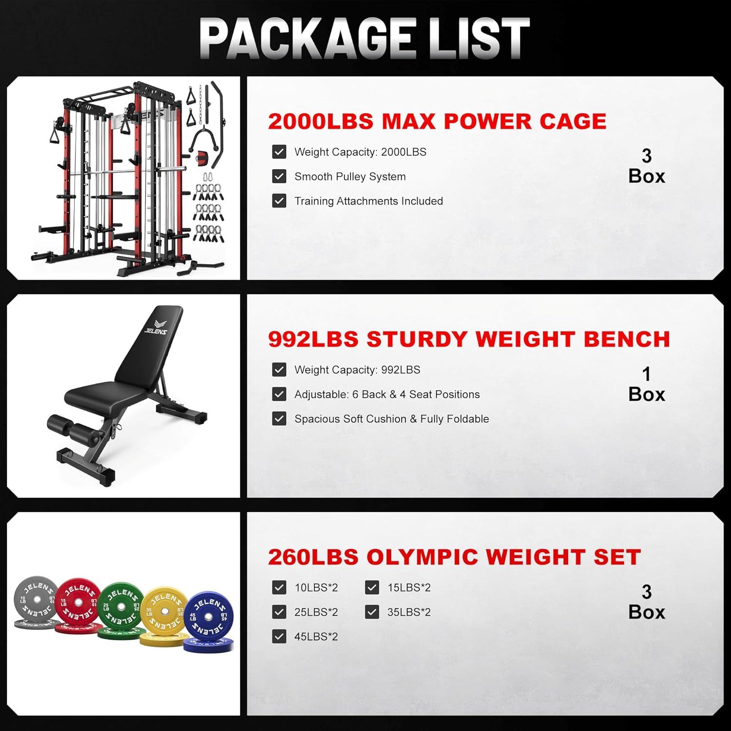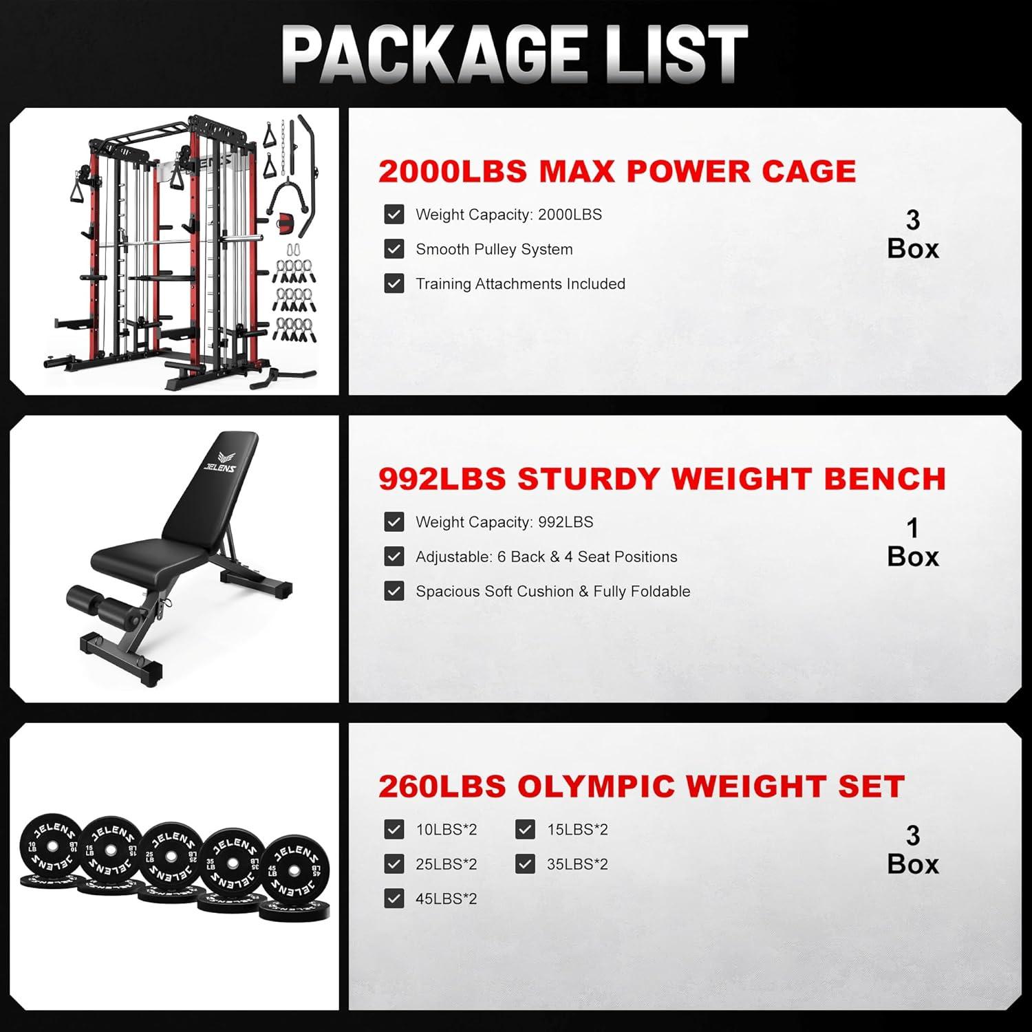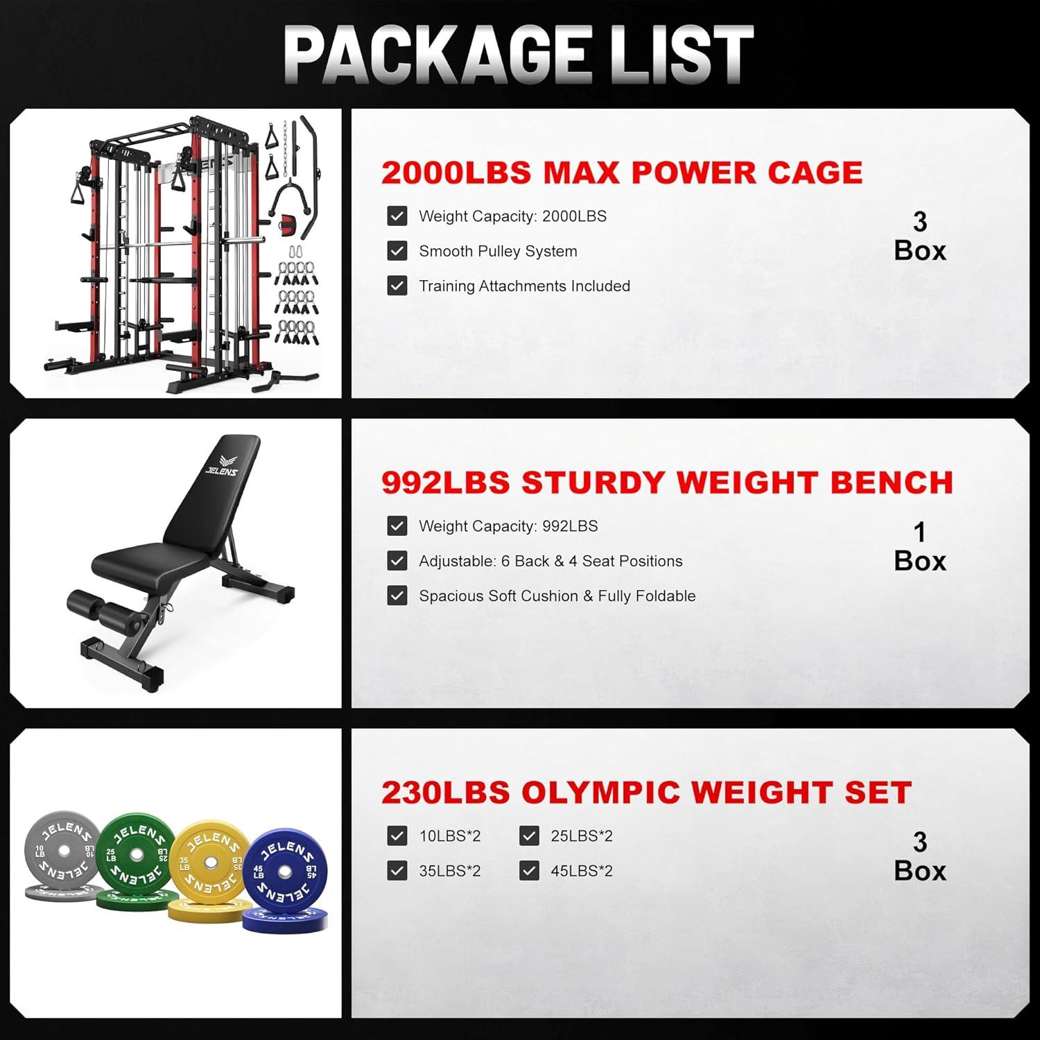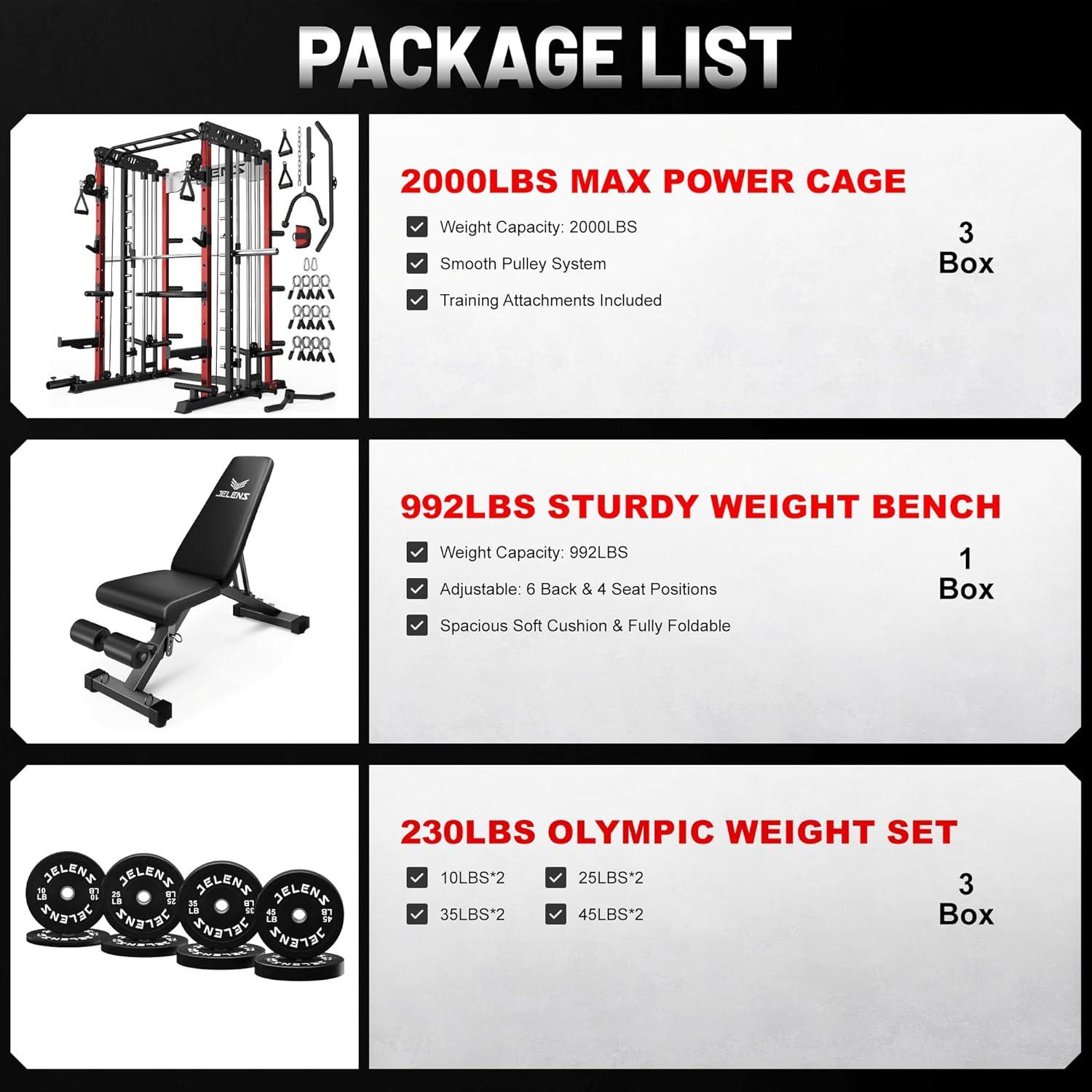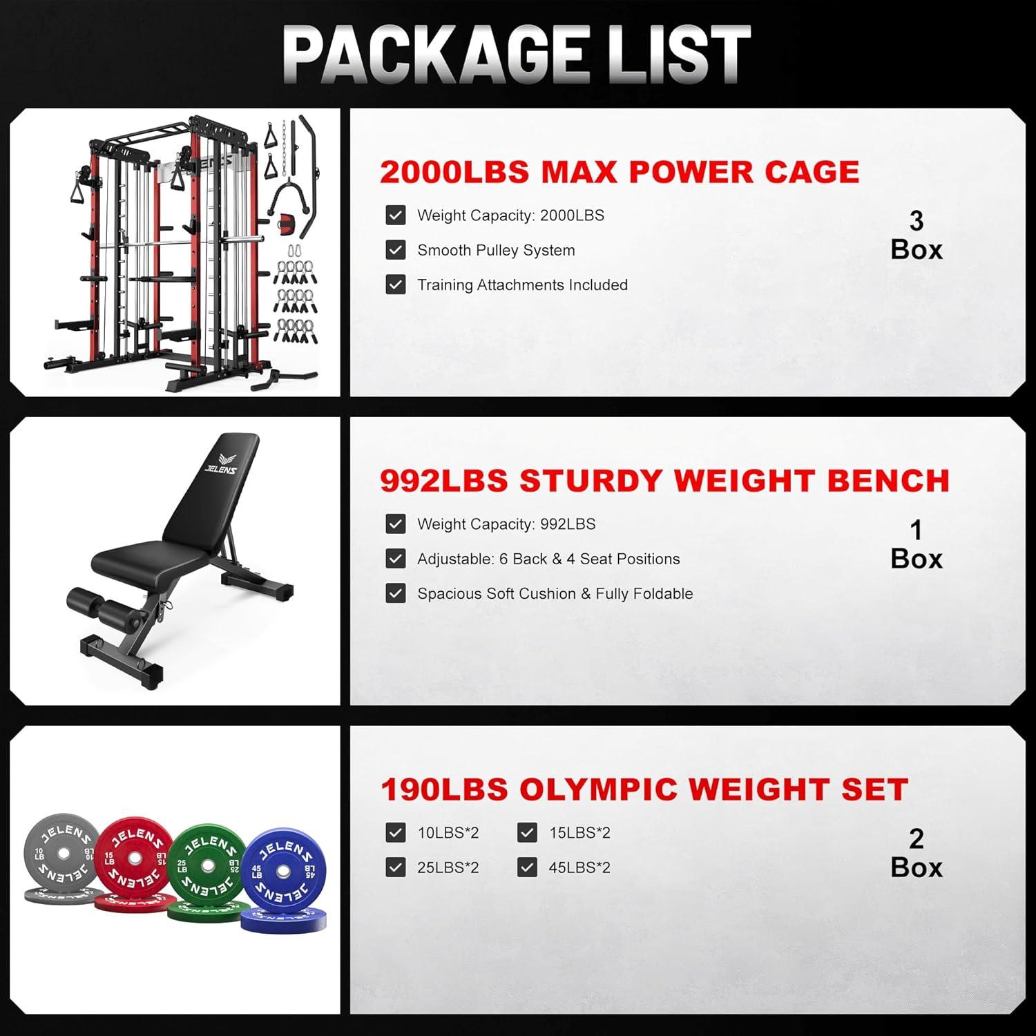 [Full-Body Workout]: With JELENS Smith machine for home gym, you can exercise your entire body using just one single machine. It's an ideal all in one equipment for squats, pull-ups, bench presses, lat pulldowns, cable flyes, barbell rows, shoulder presses, deadlifts and so on. This fitness machine provides you with a program designed for comprehensive muscle development