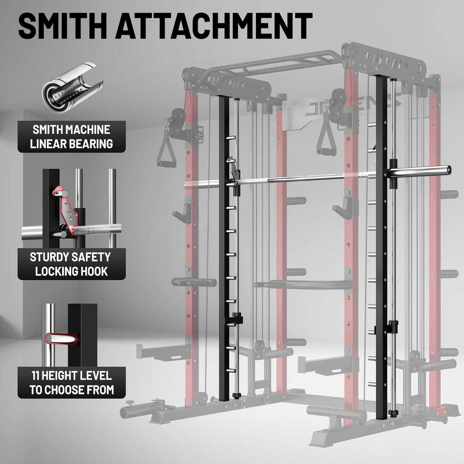 [Smooth Dual Pulley Systems]: Featuring independent dual-pulley systems, this Smith machine will be your ultimate cable-training station enabling supersets, drop sets, partner workouts without equipment conflicts. Thickened precision steel shaft pulleys paired with 7 high-strength polished steel cables ensure smooth and seamless movement with every action. This power cage can deliver minimal operational noise and creating a quiet, undisturbed training environment