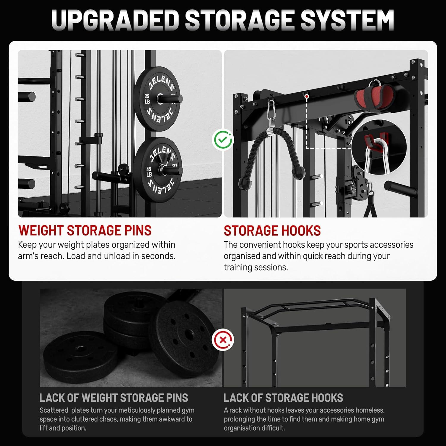 [Build Your Dream Home Gym]: This home gym workout equipment combines power cage, smith machine, cable crossover machine, cable station, and pull-up station. Equipped with 4 hooks and 6 weight storage pins, its smart storage design maintains a clutter-free and organized training zone. With an excellent Smith module, you can experience professional-grade versatility without sacrificing precious floor space
