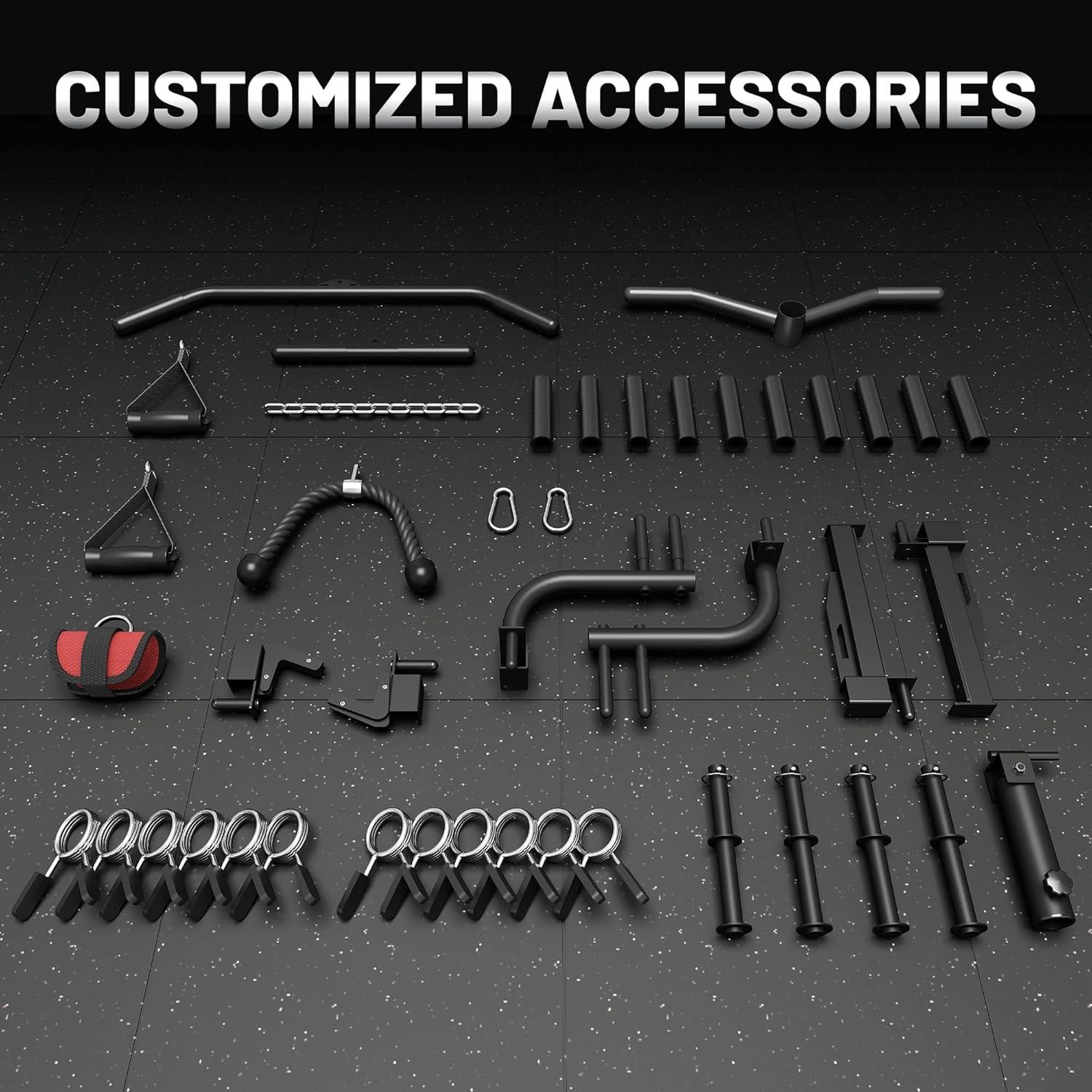 [Ultimate Versatility & Compatibility]: Compatible with various accessories including lat pull-down bar*1, T-bar*1, pull down bar*1, tricep rope*1, J-hooks*2, cable handle*2, 360° landmine*1 and so on, this workout system precisely accommodates diverse training movements while unlocking expanded workout possibilities. Featuring 11 front and 12 side holes positions, this system universally accommodates market-leading accessories to meet your varying fitness requirements